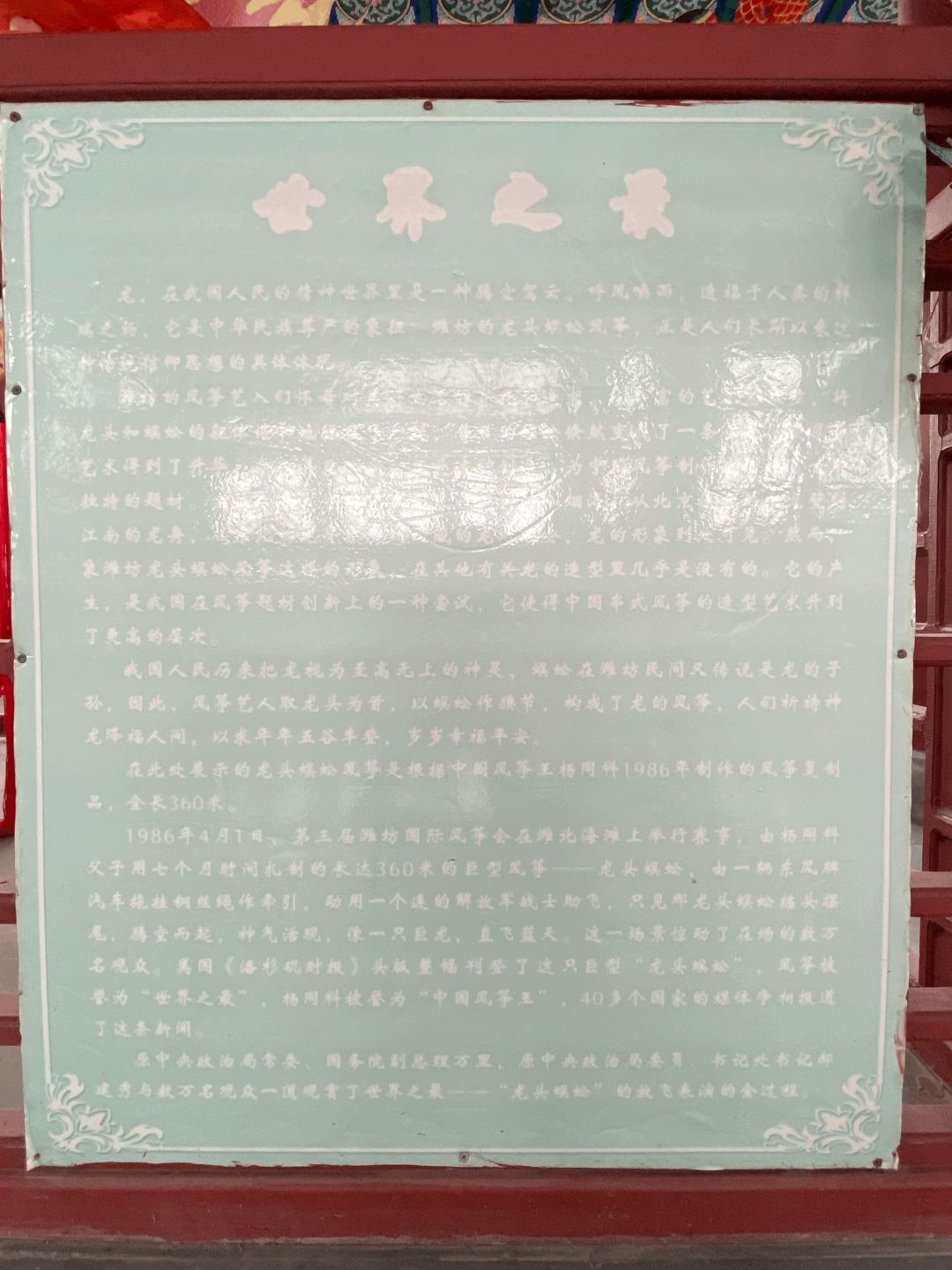 景区最高建筑是这个阁楼。本着“来都来了”的执念,我爬到了第五层,鸟瞰了整个大观园。在第三层还是第四层,有个“世界之最”,风筝之王,全长360米。
