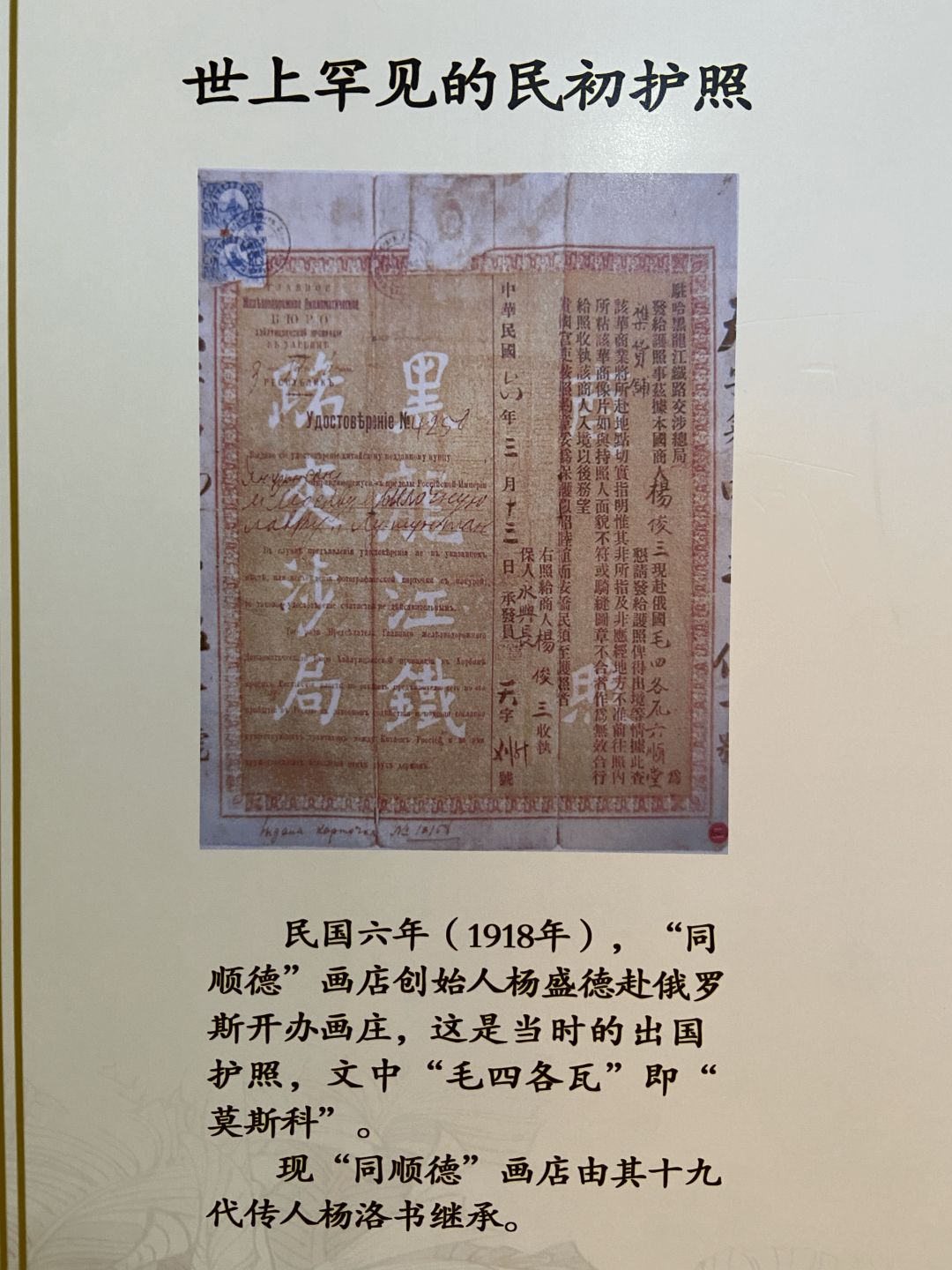 最令我感兴趣的,是一张100多年前的护照。莫斯科被译为“毛四格瓦”。当年,杨家就有人去俄罗斯开画店经商了。