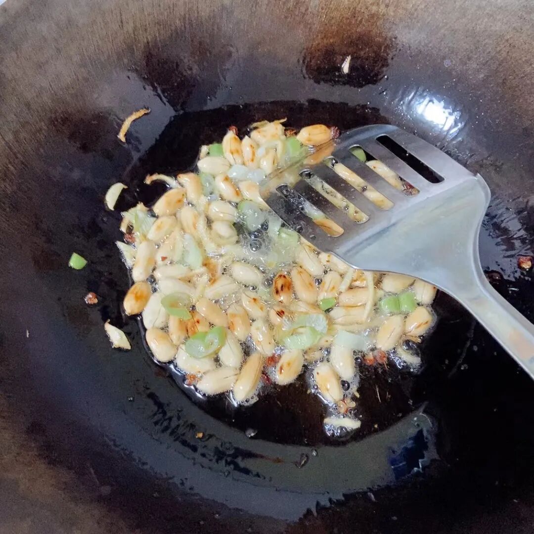 油锅烧热葱姜花椒炒香爆锅(花生米其实应该用生的,泡水去皮后放)