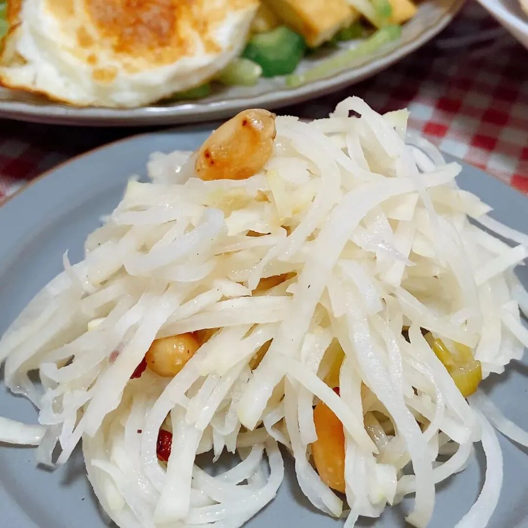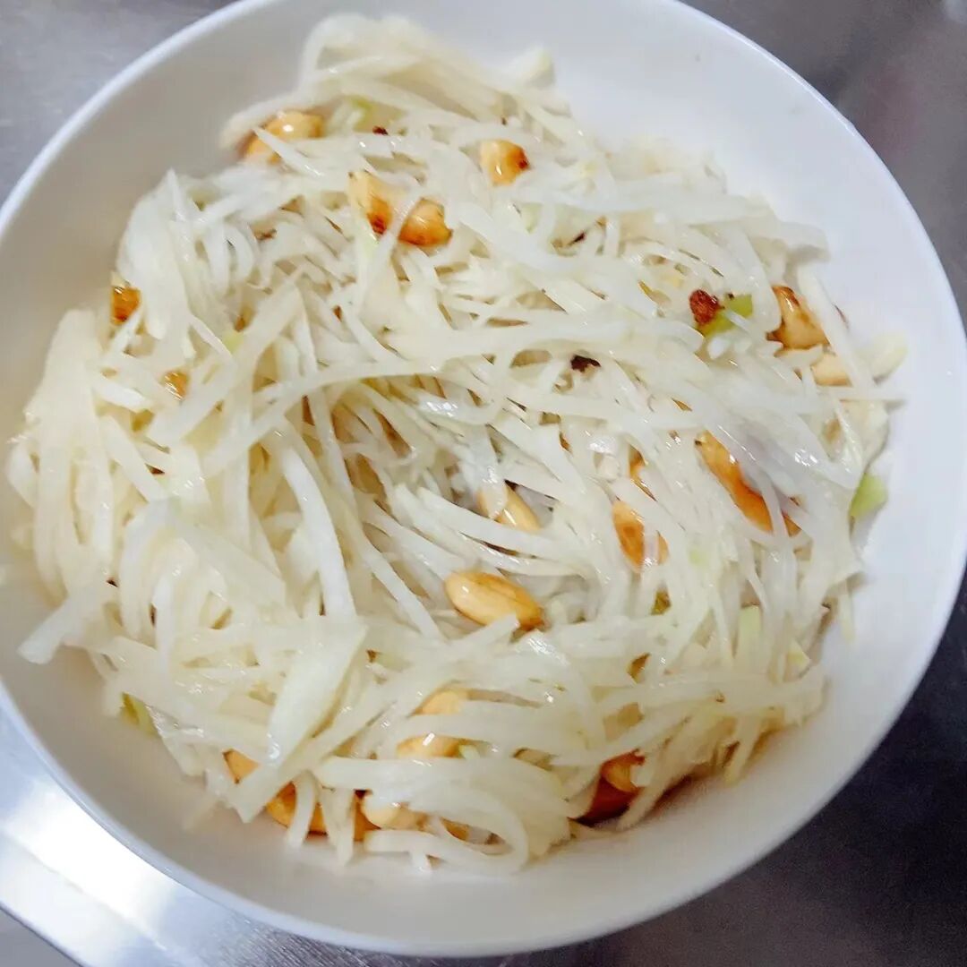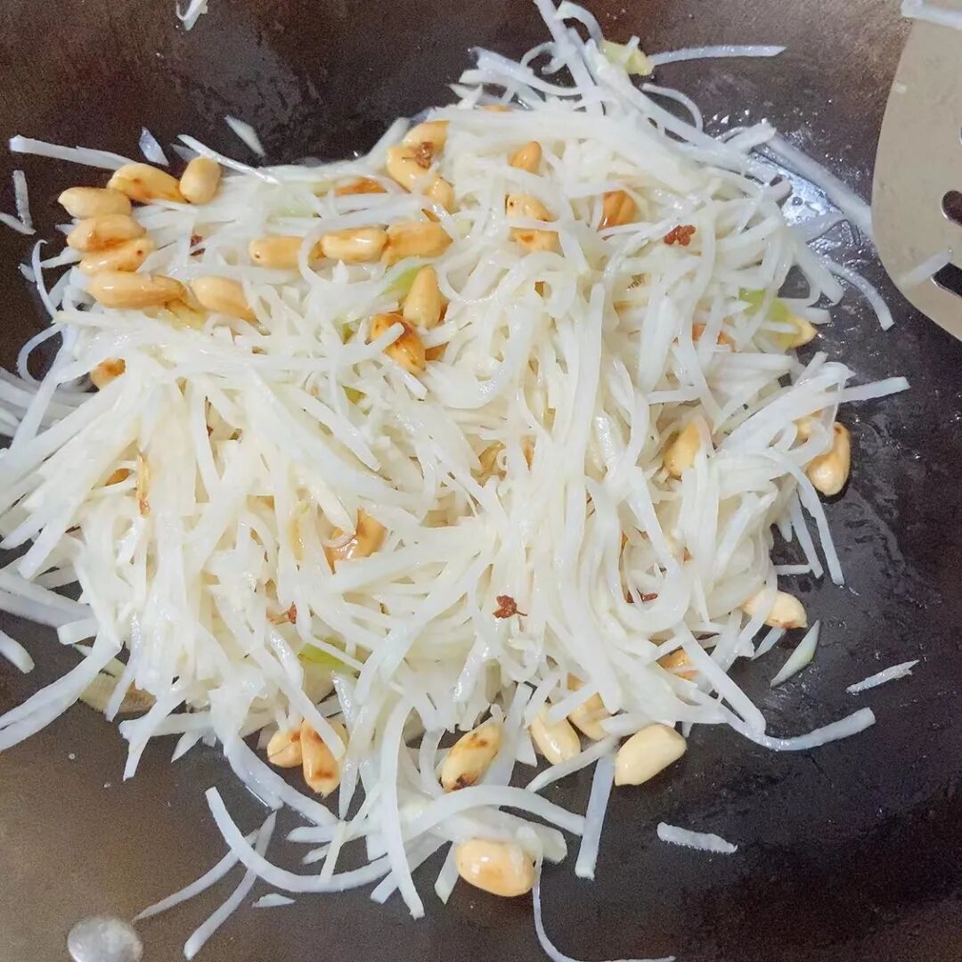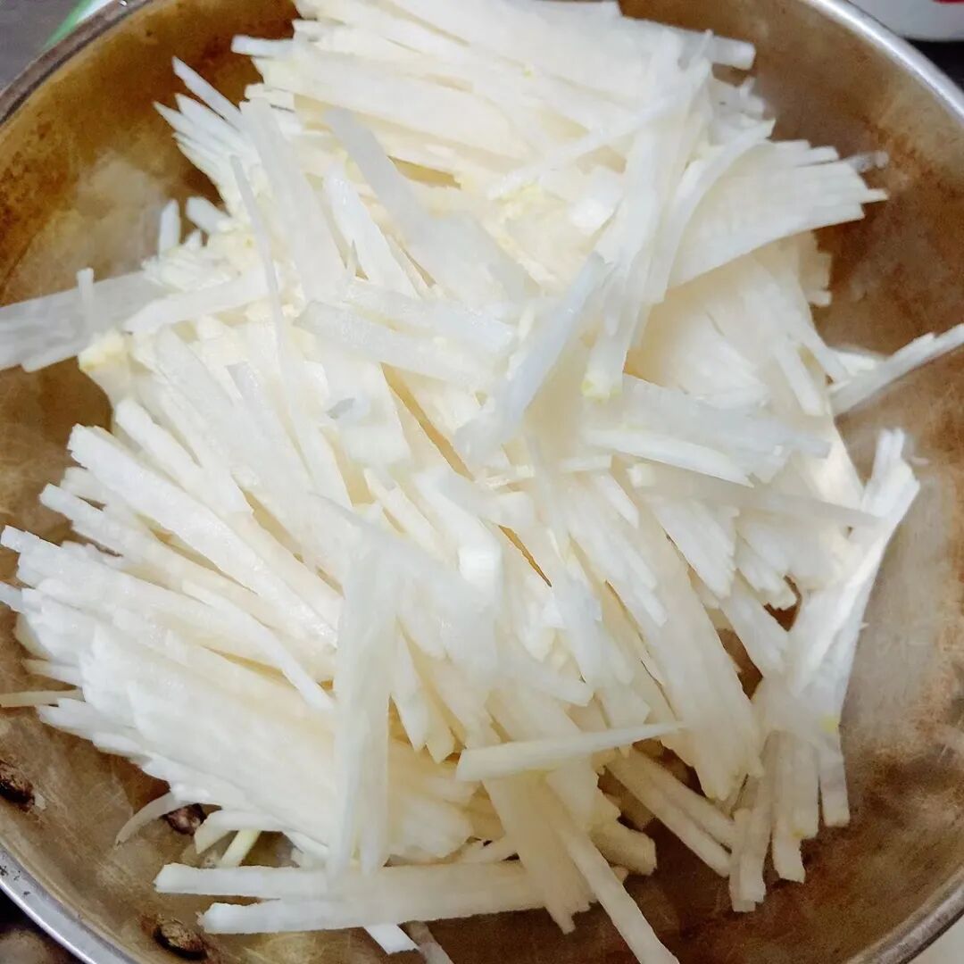 下辣疙瘩丝炒至4分熟。今天特意问我妈,说翻拌一下就行。我这个有点熟过了,没了辛辣味。