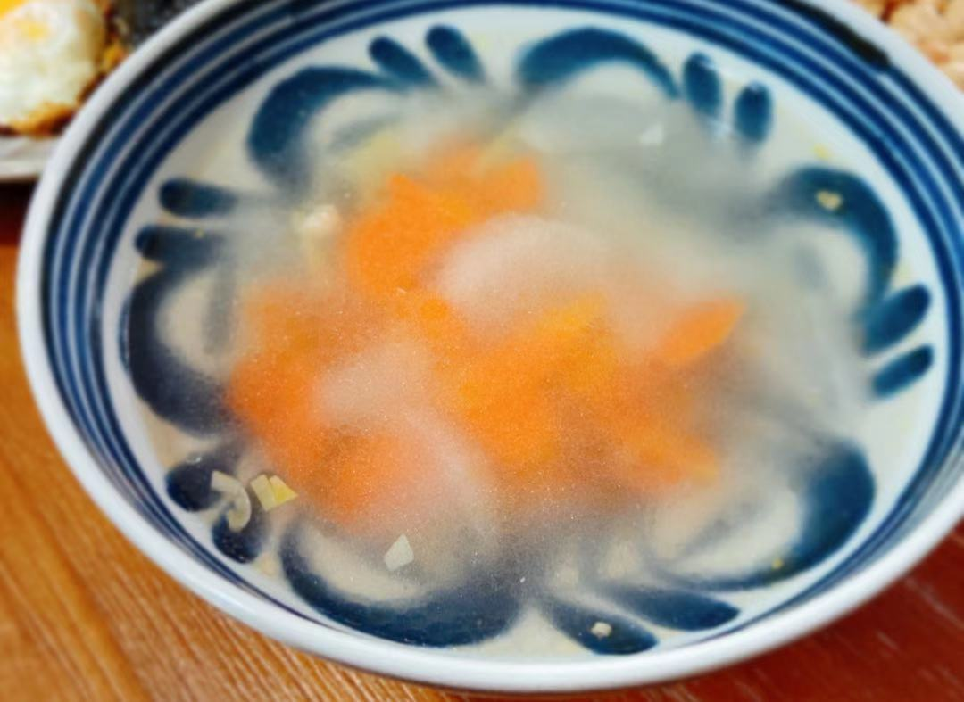 是日,老公出差在外,女儿去了淄博的同学家,我给自己煮了碗萝卜汤,食材是少许白萝卜,少许胡萝卜,两片姜切丝,快出锅时撒了点白胡椒粉,淋了点金蒜油。