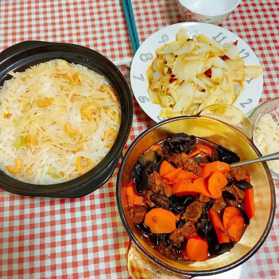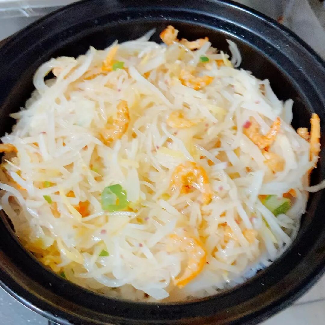 萝卜丝煲仔饭是跟一个南宁的博主学的。因食材易得,做法简单,偶尔也会做一次。现在很少做白米饭,基本是菜饭一体。
