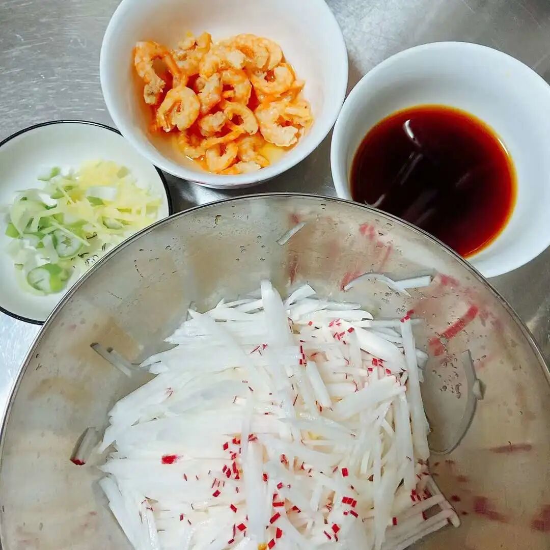 a,将海米洗净,用料酒或米酒浸泡一二十分钟,萝卜切丝或擦丝。