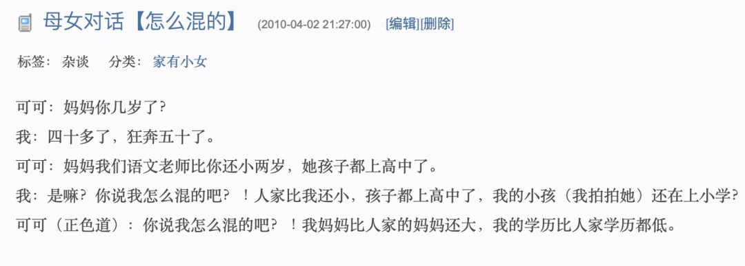 比如2010年4月2日的一则《母女对话》,如果不翻看博客,我压跟不会记得她10岁时的这则有趣的对话。