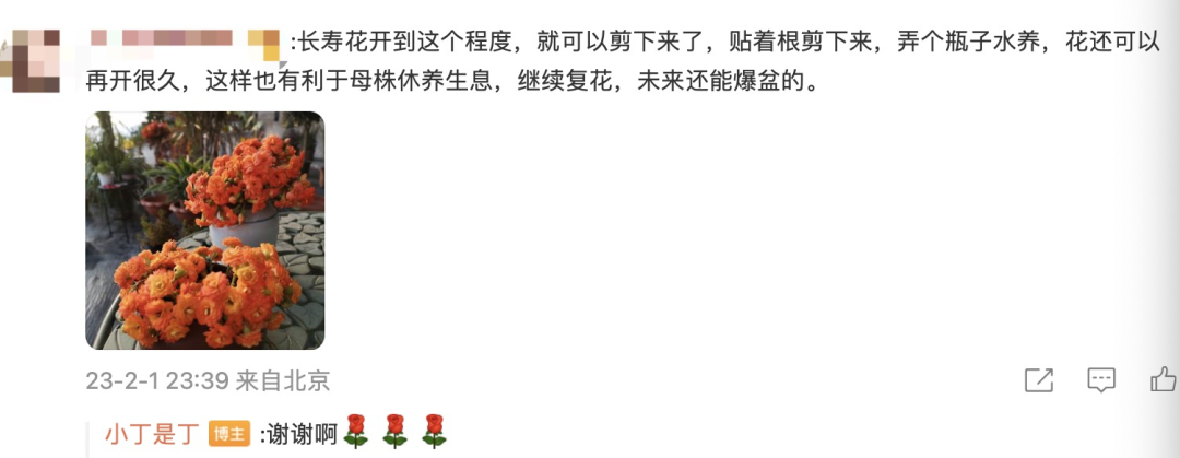 我晒了花草的一组照片。有个博客时代就关注的网友留言,说长寿花开到那个程度,可以剪下来了。