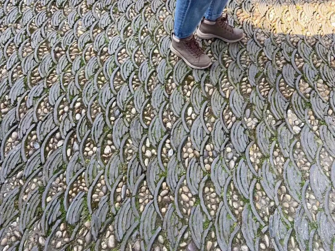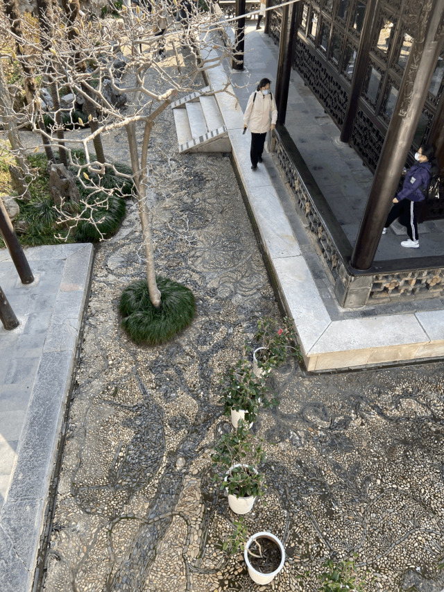 东园船厅系单檐歇山式建筑,带回廊,厅似船形,四周以鹅卵石、瓦片铺地,花纹作水波状,给人以水居的意境。我专门拍了照,如果不看介绍,大概不会联想到水波纹抑或波浪。