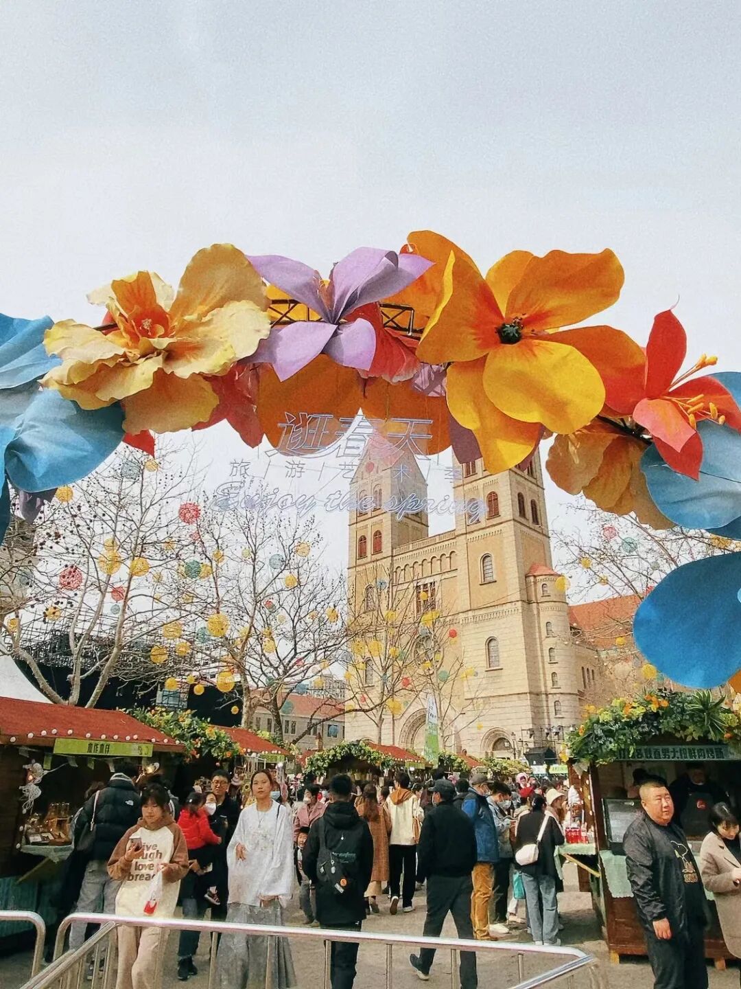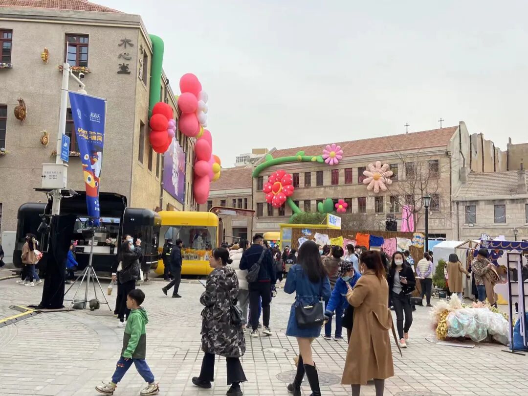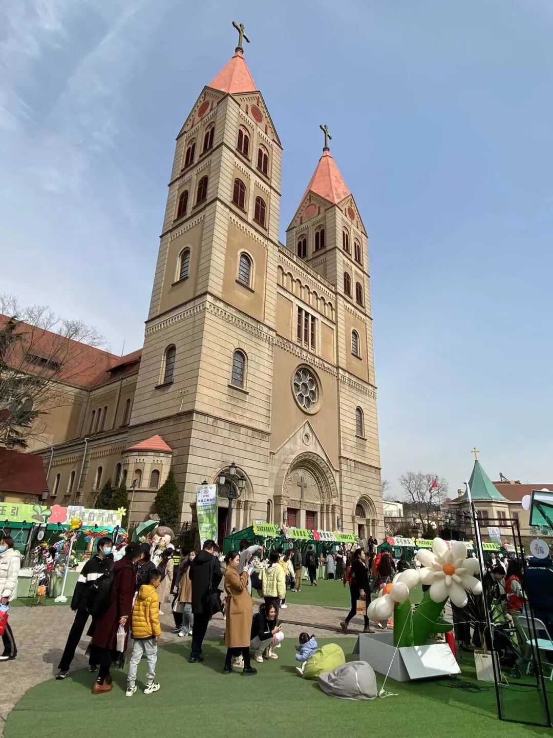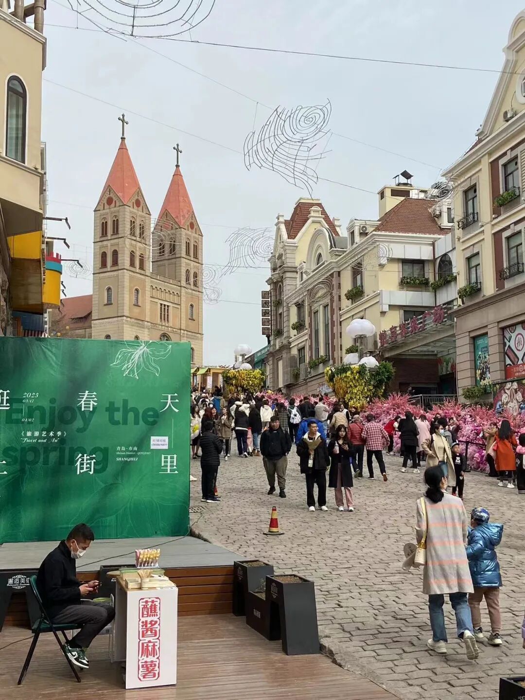 青岛的春天比山东其它城市来得似乎晚一点。玉兰正在花季,杏花也刚开好,樱花绽放尚需时日,中山路、上街里倒是随处可见春天的气息了。连圣弥厄尔大教堂前,都布置成了市集。教堂对面临时搭建的舞台,正在演讲的是一位年轻艺术家,讲述着街头设置的大艺术家雕塑的设计灵感。台下画架前坐着的,是学画的儿童,围观的,是逛春天的人们。