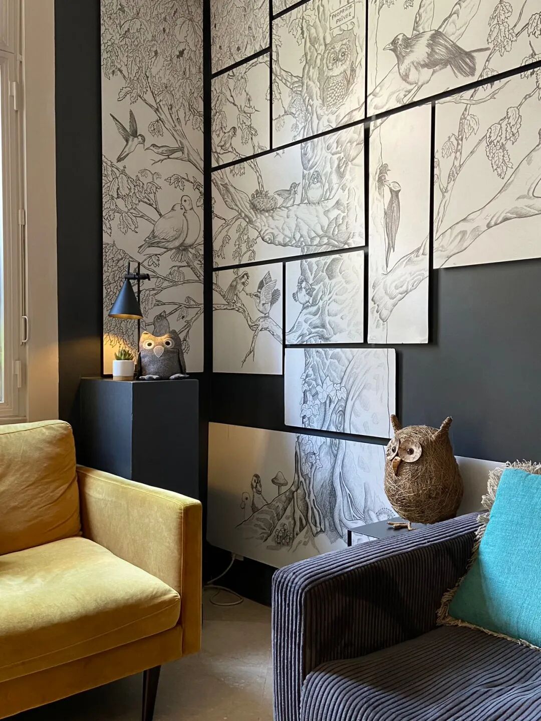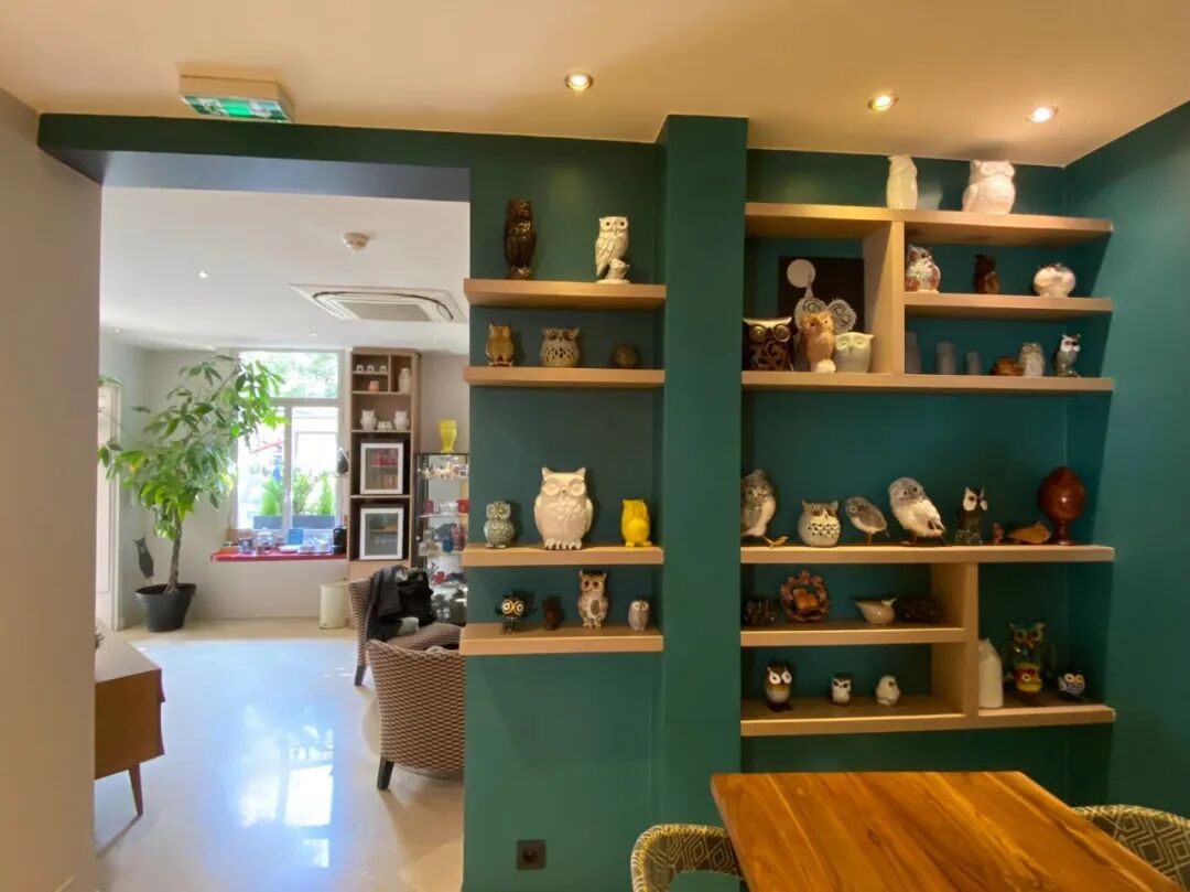 我们住在十五区的一家酒店,软装配色也很养眼。摆件、装饰画、名片、房间门牌、房卡等等,处处表现着猫头鹰元素。