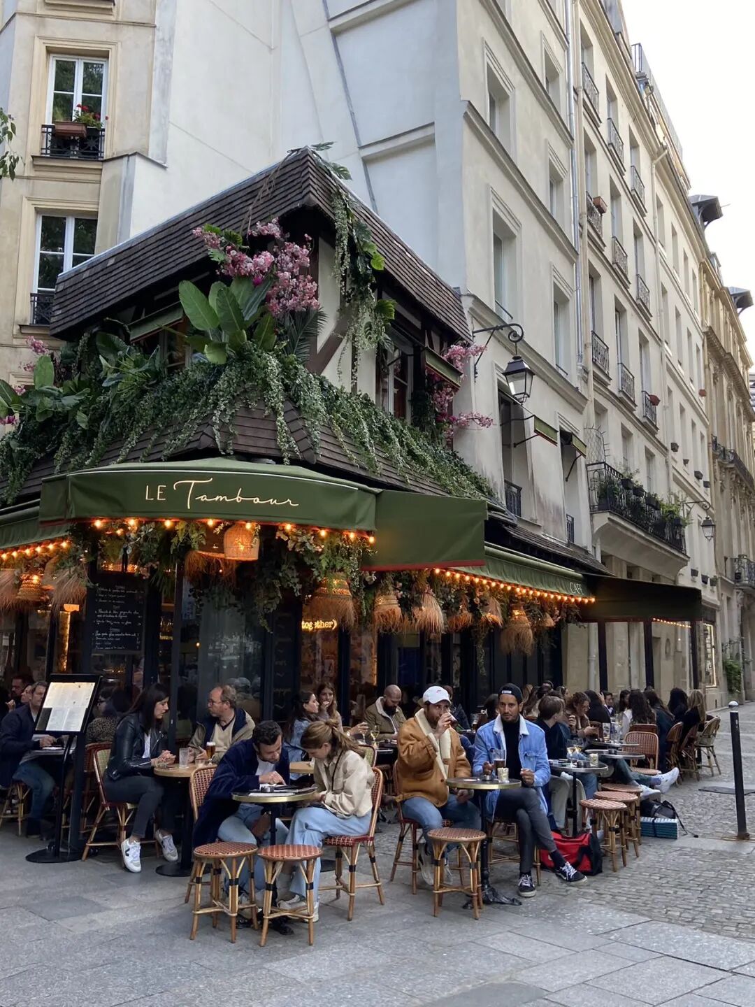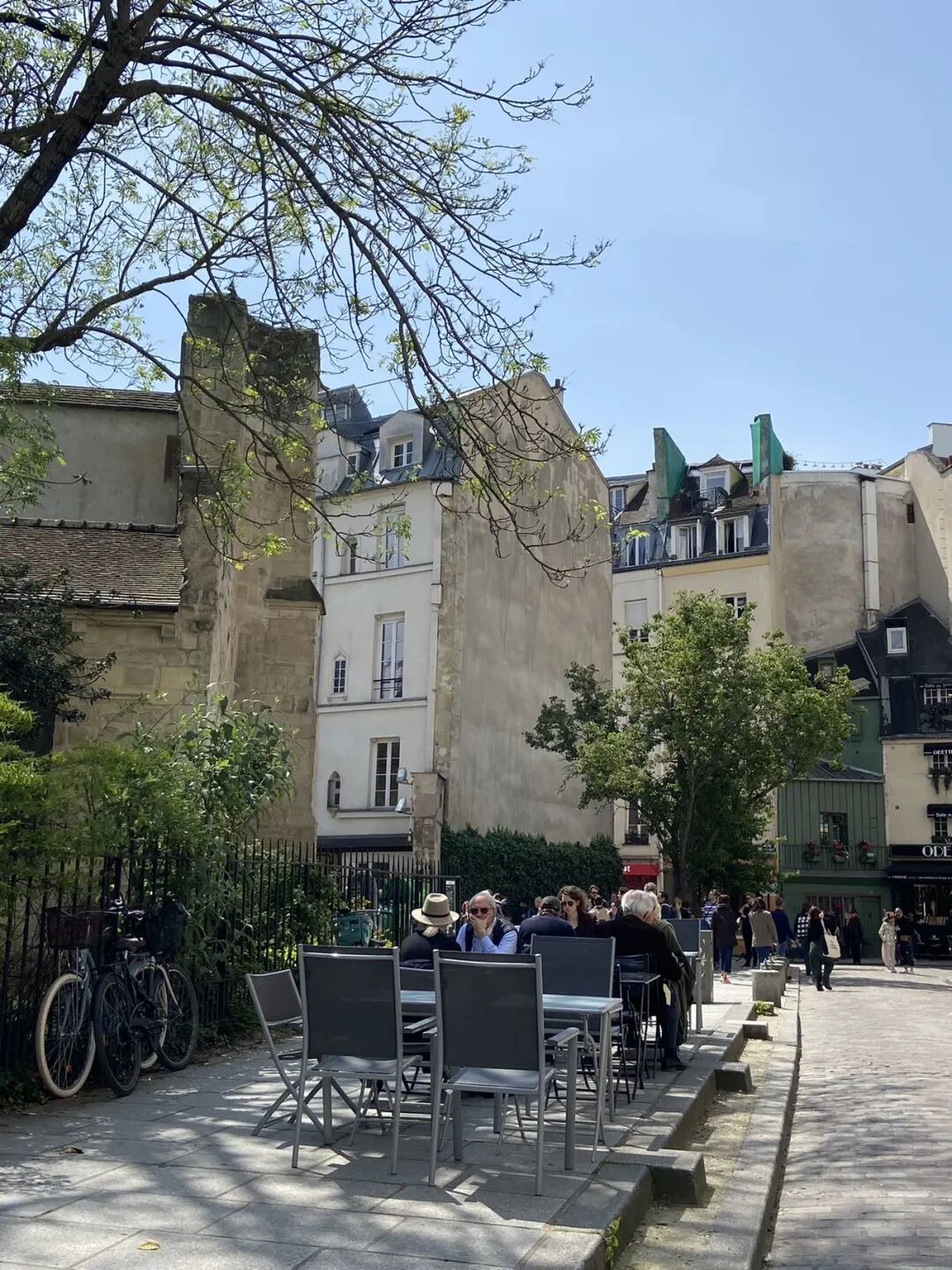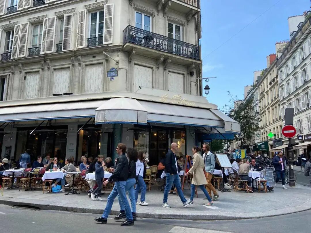 路边咖啡馆餐馆也是巴黎一景。好像每家路边餐厅都有室内室外桌,现在是巴黎的春天,人们更愿意在室外用餐,面朝马路,喝酒喝咖啡聊天发呆。