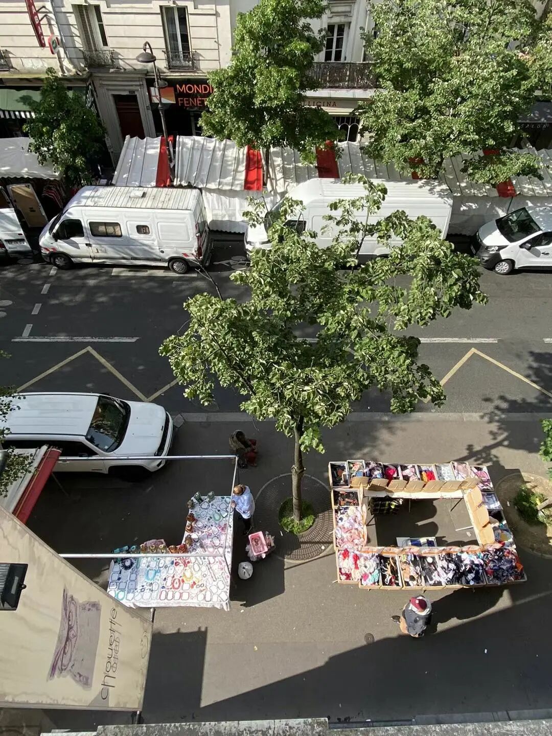 入住酒店的当晚,是九点多钟,天还是亮的。我发现路边有很多铁架,还以为附近要搞房屋维修。次日清晨打开窗户,才赫然发现:原来楼下就是市集。那些架子搭上雨蓬,遮阳又避雨,供商家摆摊。摊位就摆在人行道上。
