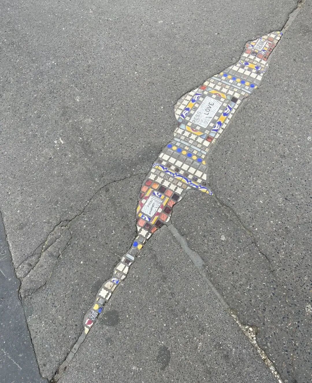 路面出现裂痕,用贴瓷砖的方法进行了修补。