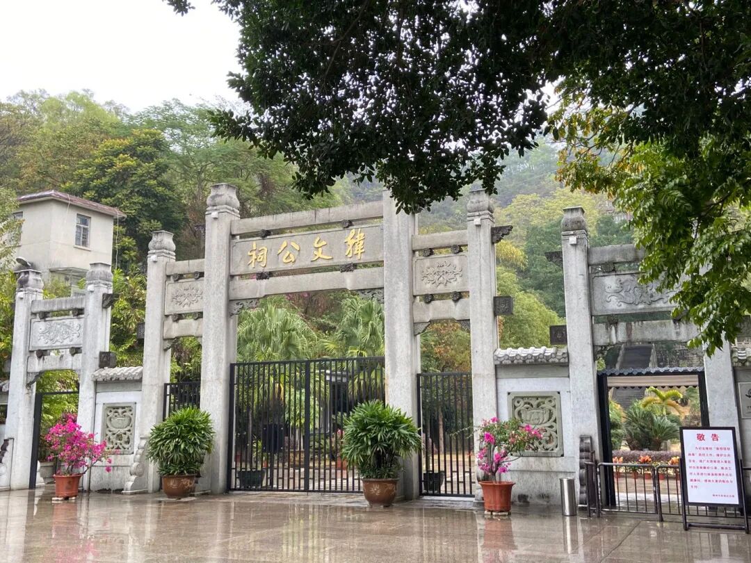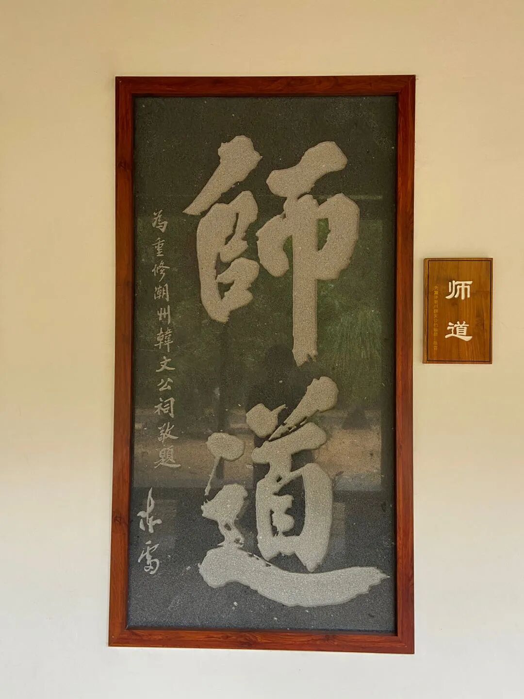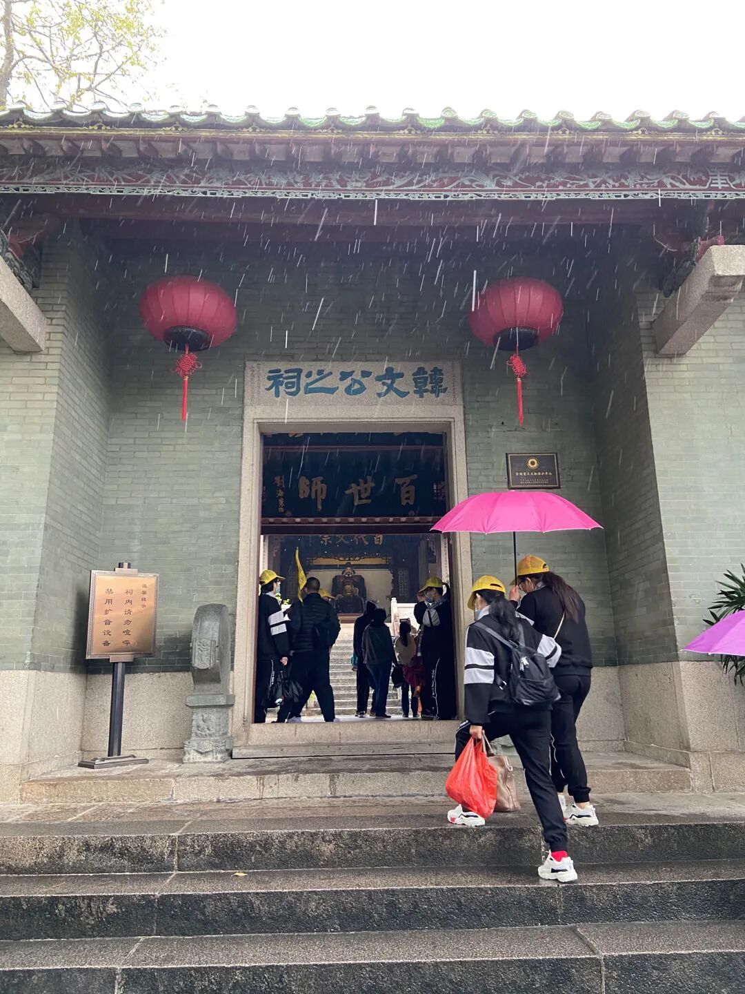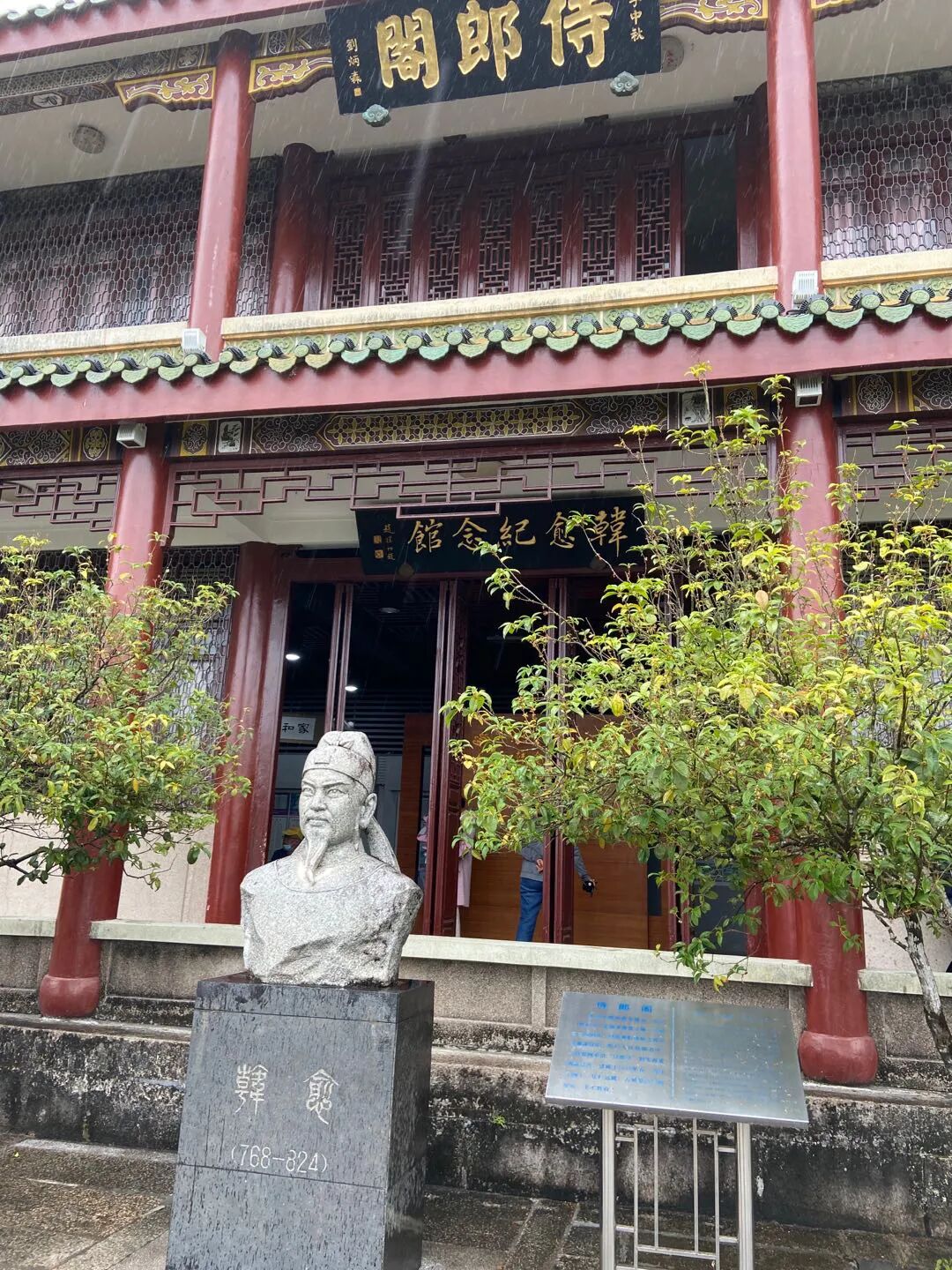 在侍郎阁,一个售卖纪念品的柜台免费向游客派发《弟子规》,女店主把一只大毛笔递给一个男孩,让他手握毛笔以韩山的风景画为背景拍照,祝他能考上清华北大。韩山原名笔架山,因山形似笔架而得名,这样一份期许发生韩文公祠,应情应景,男孩和父母都欣欣然的。