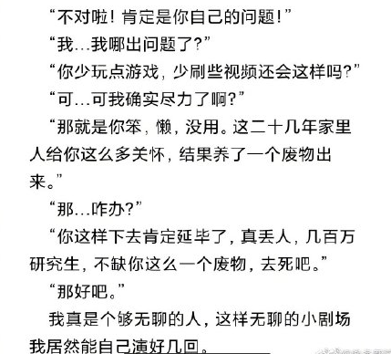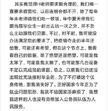 还有,在实验室自杀这种行为,更是不懂事的表现。给学校、给老师同学、师弟师妹们添了多少麻烦?不麻烦别人,也算死亦有道。