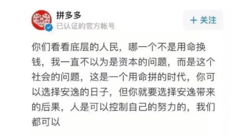 话说回来,这可能就是拼多多公司内部真实的声音,像小米高管说“得屌丝者得天下”一样。