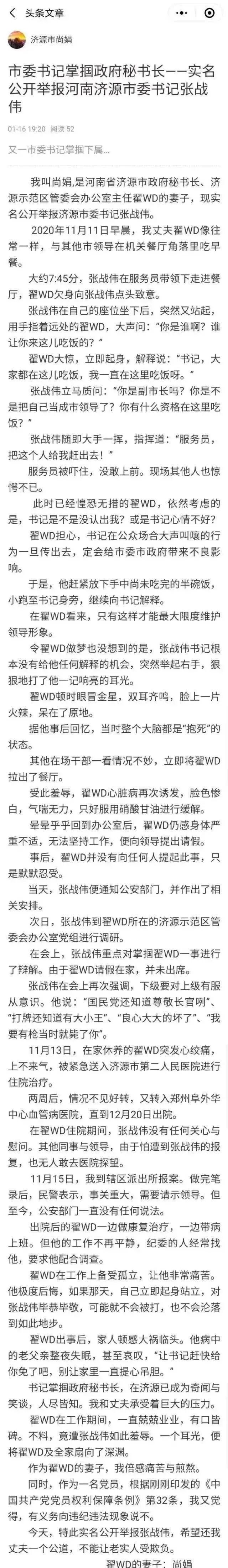 1月16日,河南济源市政府秘书长翟伟栋的妻子在微博公开举报,说她丈夫在机关餐厅小食堂吃早餐,被市委书记张战伟斥责,嫌他级别不够,不配在那里吃饭,还打了他一个耳光。