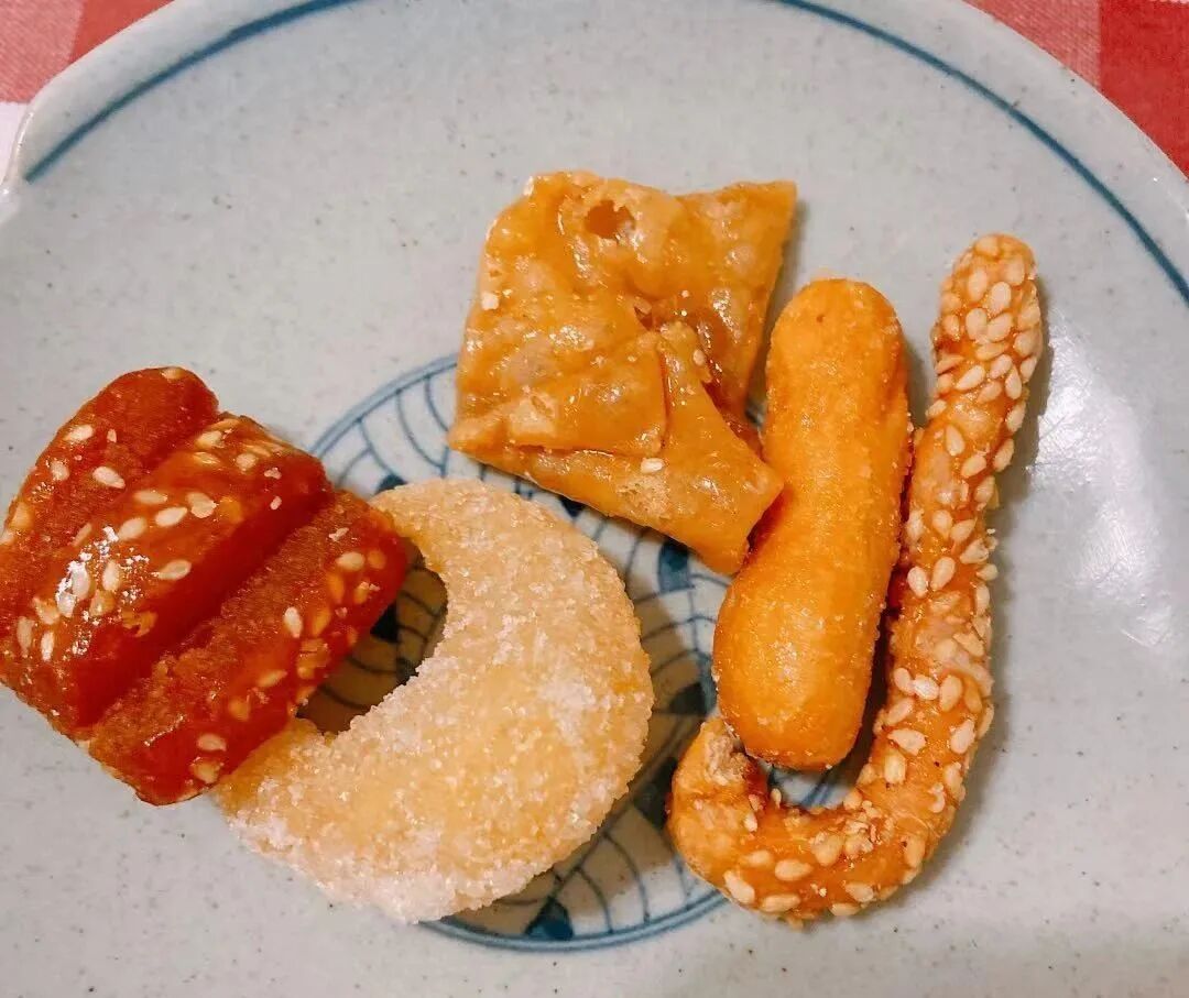 左起:蜜三刀,羊角蜜,仨角(读sa jia),雁屎果子,江米条