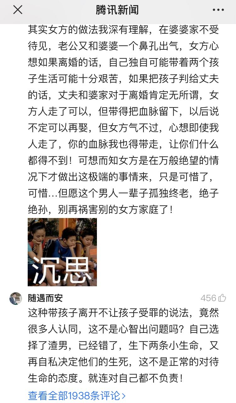 可是,可是,再大的同情,也难以接受“怀抱两个孩子跳楼”这一选项。