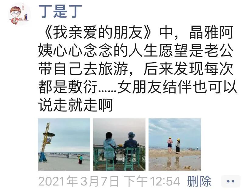 那一刻,联想到《我最亲爱的朋友》中的晶雅阿姨,她心心念念的人生愿望是退休的老公带自己出去旅游。后来发现大男子主义的丈夫每次只是敷衍,从来也没真正把她出游的愿望放在心上。伤心之余,晶雅默默在外租了房子,准备跟老公离婚。
