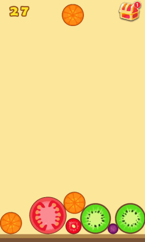 圆圆的水果有物理碰撞机制,会从高处滑落,会因为体积变大将周围的水果挤压到一旁。