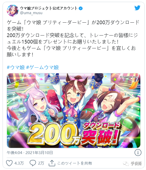 虽然等了那么久,但是游戏的质量确实不错。加之游戏推出之前,《赛马娘》的两季动画也很能打,起到了强力宣传效果。最终,本作早早收获200万下载,以及半个月57亿日元(折合人民币约3.4亿)的惊人收入。