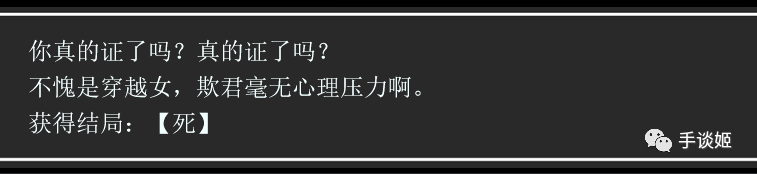 而且,游戏中也有许多因为答不上来的死法。借用范仲淹的话,是进亦忧,退亦忧。真可谓尔虞我诈,勾心斗角,鲜血淋漓。