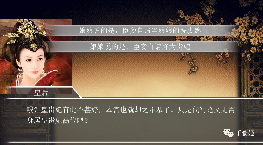 皇后表示要降姬的官职,手谈姬是要成为洗脚的婢女呢,还是要降为贵妃呢?