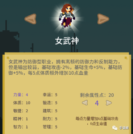 刚开始,和大多数rpg游戏一样,需要创建人物。游戏目前有勇者、黑袍、红帽、女武神四种角色可选,不同角色有相对应的加点机制。