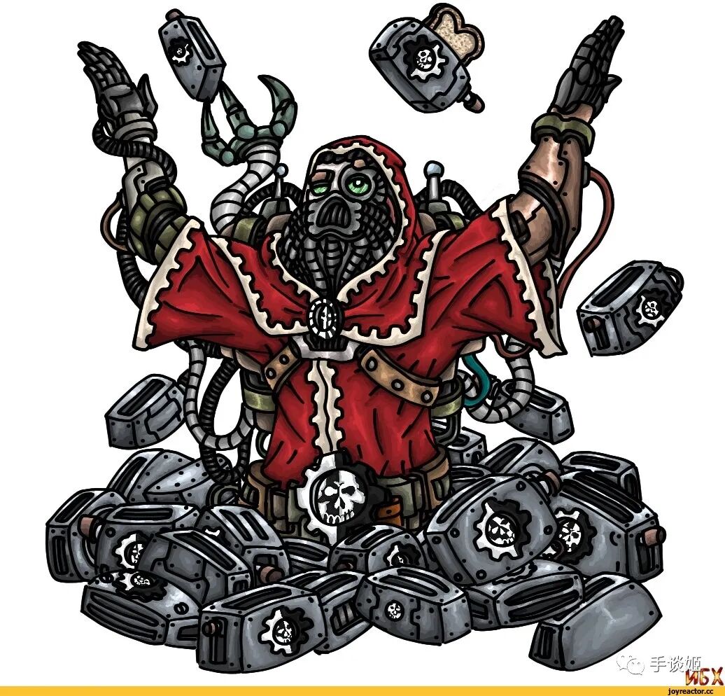 肉体软弱,机械神教崇拜机械之神,喜欢将自己身上的零件拼拼凑凑,或者说把各种强力的武器、机械部件安装在自己身上,虔诚又肃穆。