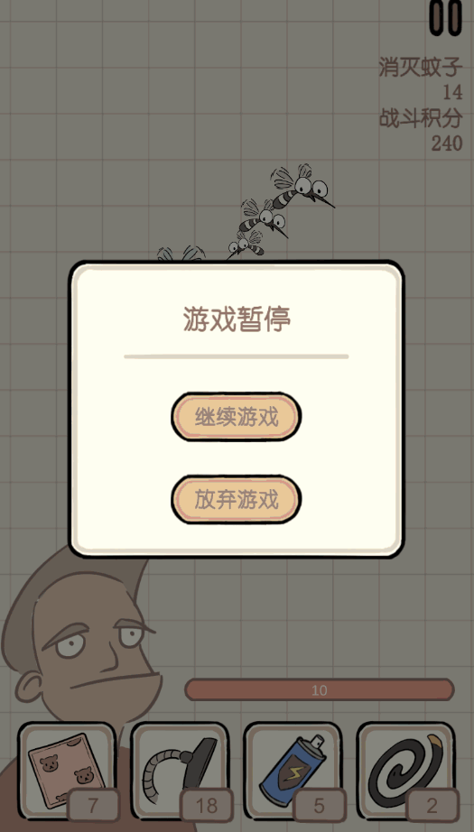 此外,游戏中还有一些“装备”,可以用于打蚊子,比如纸扇、苍蝇拍、拖鞋、杀虫剂等,这些道具间也有着各样的用途,比如玩家可以把“手帕”套在头上,这样就可以在一定时间内抵挡蚊子的攻势,又或者使用“煤气罐”,在攒够一定时间后就会发生爆炸,进行aoe范围伤害。这些道具的出现无疑让游戏变得相当有趣。