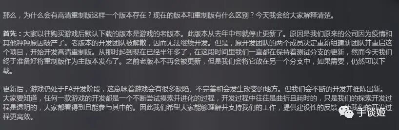 在版本更新的介绍中,官方表示重做了游戏中的新图形、升级了捏脸系统、改进了战斗等诸多细节。而且阐述了下自己的不易与坚持——原来开发这游戏的公司倒闭了,两个制作组成员不愿意放弃,重新组建团队接手继续制作,花费半年才肝出新版。