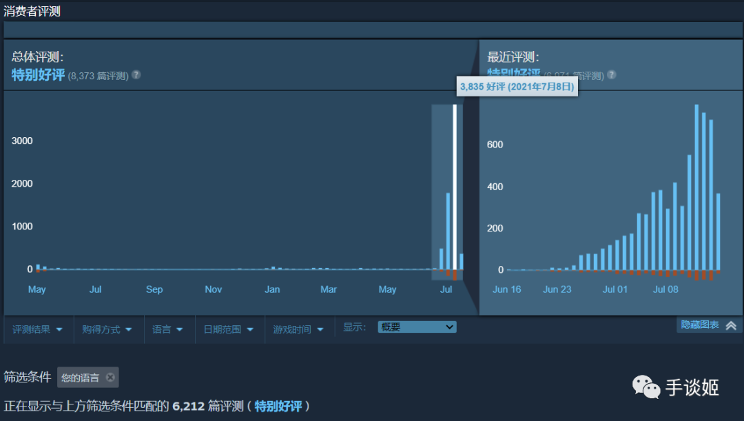 游戏销量从6月24号窜窜上升,最高同时在线人数超过万人,几千条评测也都是“特别好评”,让人不由怀疑世间到底有多少单身汪。