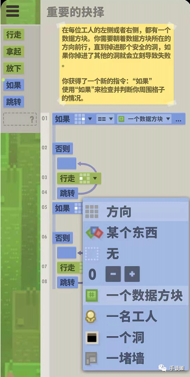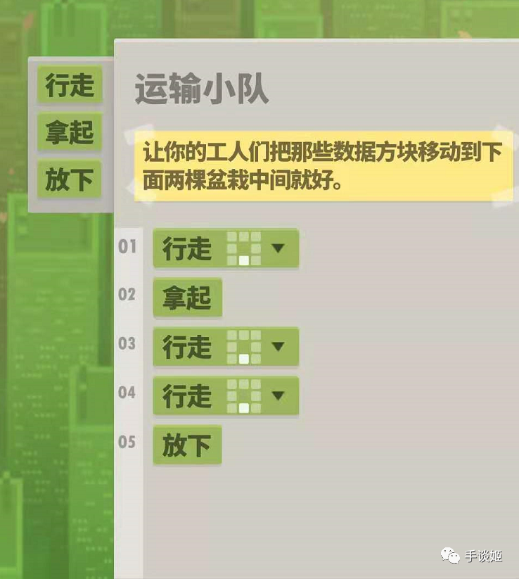 游戏的前几关相当于教学,会介绍游戏代码的机制,比如基本的“拿起”、“放下”、“行走”的指令。