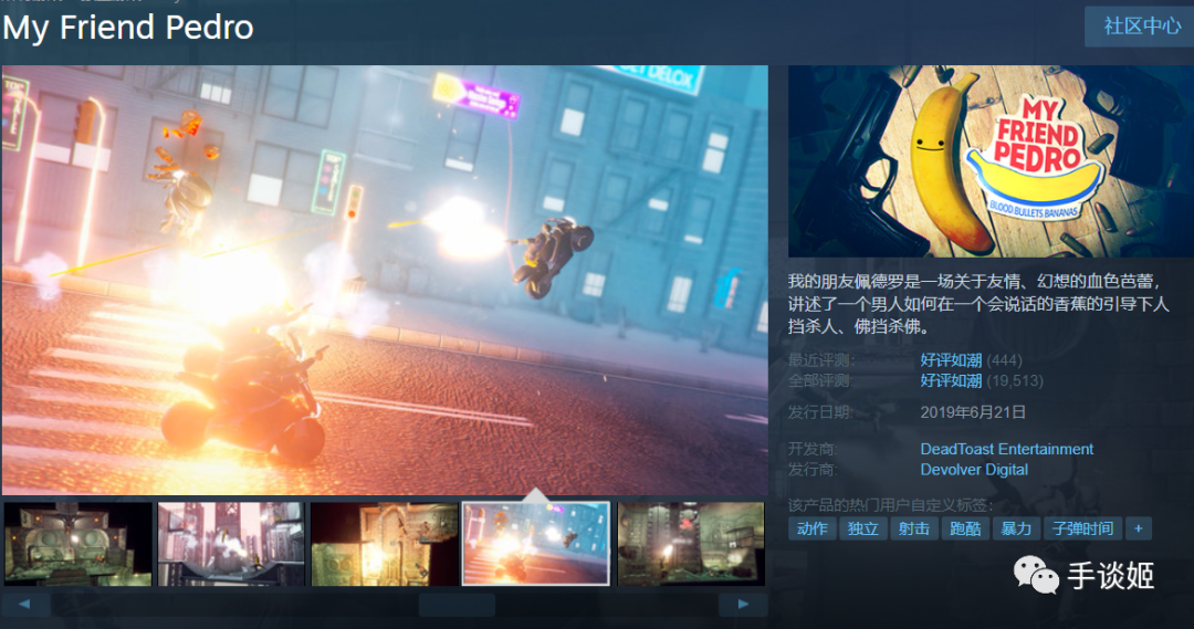 今天手谈姬推荐的就是一款family被抓走的游戏,名叫《My Friend Pedro: Ripe for Revenge》,中译:我的朋友佩德罗:后面懒得翻了。值得一提的是,游戏还有一个同名PC版本,拿到过2019年Steam的最具创意玩法大奖,感兴趣的姬友也可以尝试下。