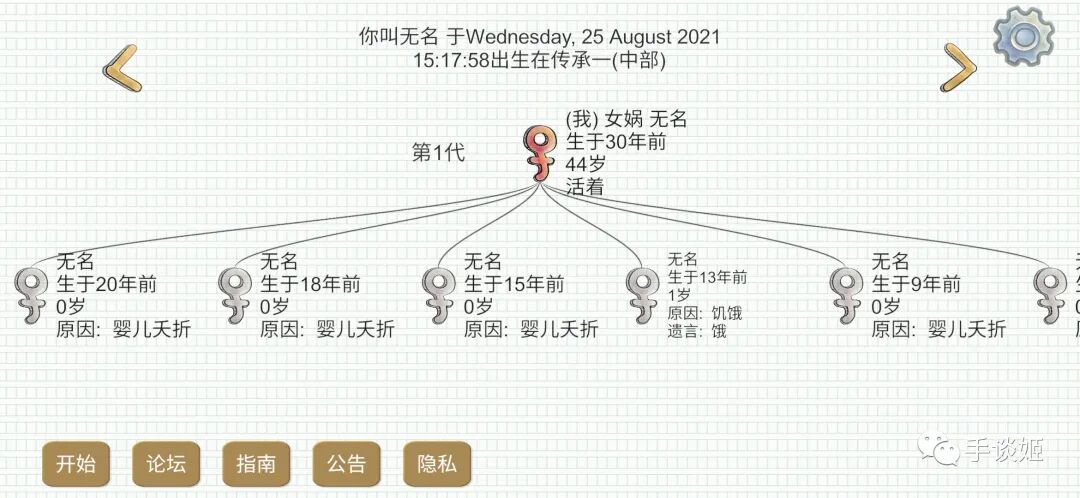游戏会随机分配给重来的玩家两种角色,一是14岁的女性角色“夏娃”,二是0岁的小婴儿(新手活过35岁才能解锁),小婴儿前几岁只能由妈妈喂养大,没有行动能力,所以玩家间的互相帮助非常重要,毕竟是亲生的!