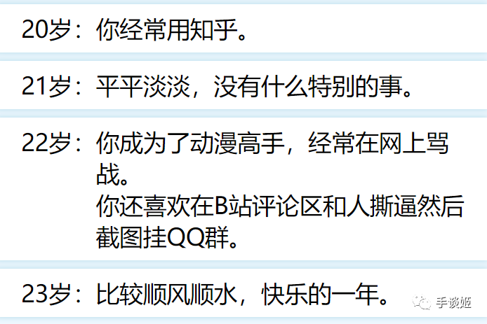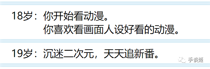 过了17岁,手谈姬终于在游戏中18了,游戏说姬开始看动漫,还是个人设党。到了19岁就成了个二次元……