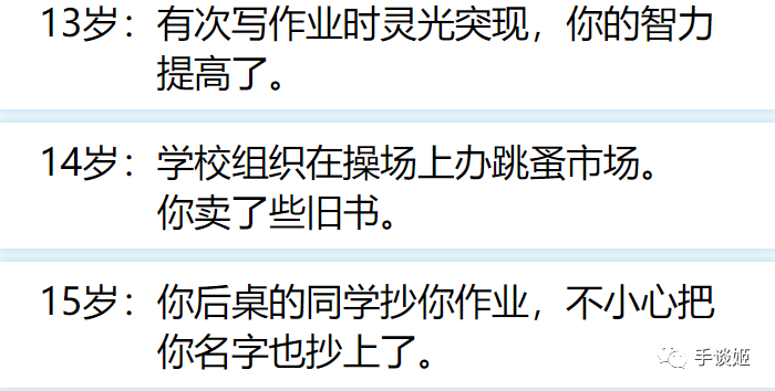 这些事件并不意味着一定和自己的年岁有关,但这开局看起来挺开心,又有组织力又自己写作业,虽然姬一点智力也没加,还是挺聪明的。