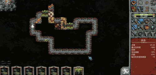 战胜敌人后会掉落卡牌和装备,而玩家可以把卡牌打出在地图上,产生相应的效果。(掉落是随机的,不过能掉哪些卡可调整卡组决定)
