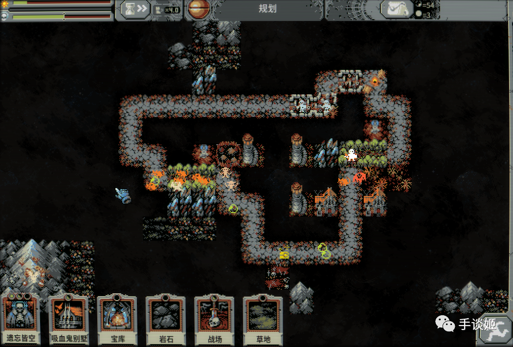 比如,你放一个村庄卡牌在道路上,下一次人物路过村庄地块,就能接到一个任务;种下田地卡牌,你路过后能回血;放置一个吸血鬼宅邸,地块会逐渐生成吸血鬼,待主角路过时触发战斗。