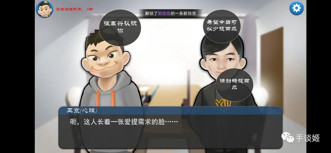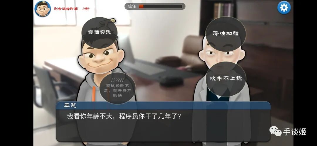 老总会问你从工作经验到工作技能到工作理念等等方面的问题。如若贴合他的心意,信任值便会上升,达到蓝色状态,面试成功通过。