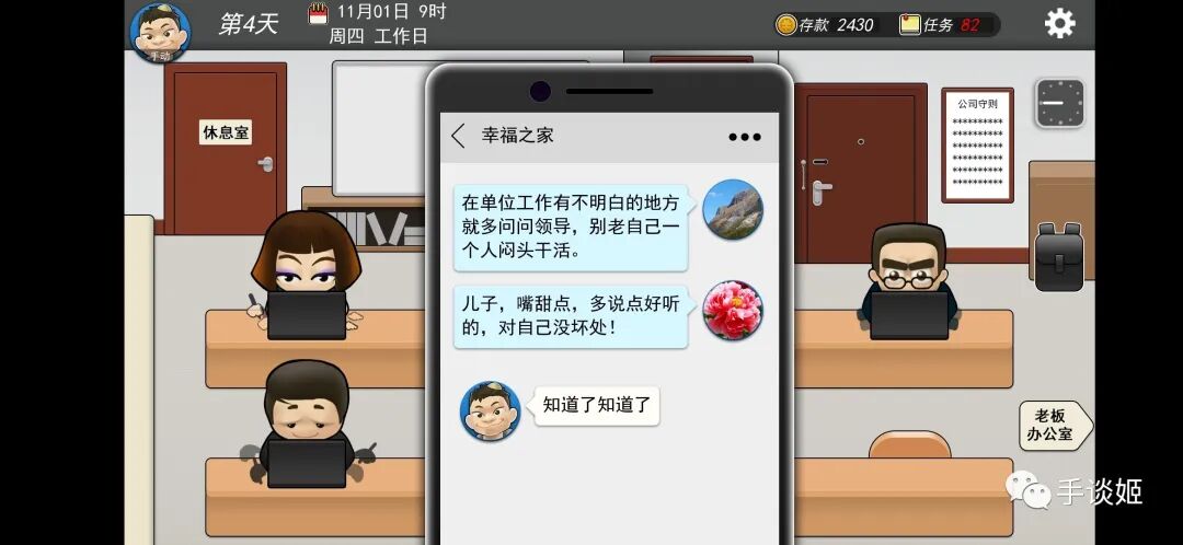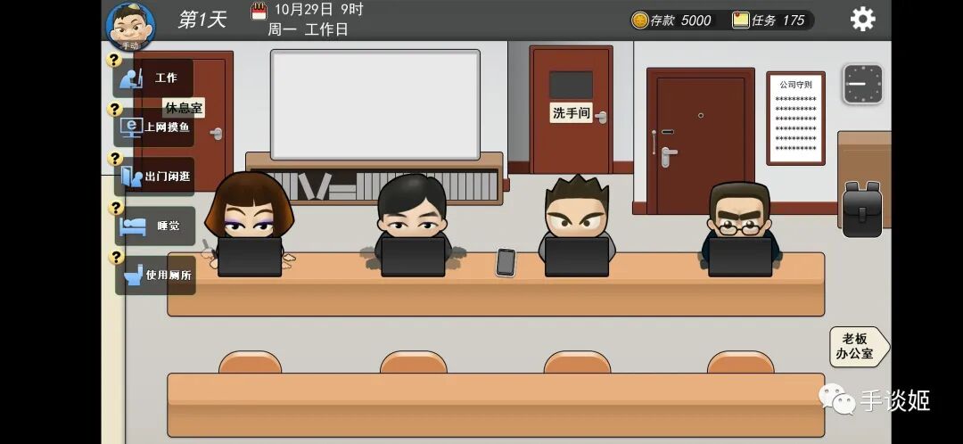 每天都会有新任务下达,工时间,你可以点击左边的选项进行选择,要么认真工作,要么偷偷摸鱼。