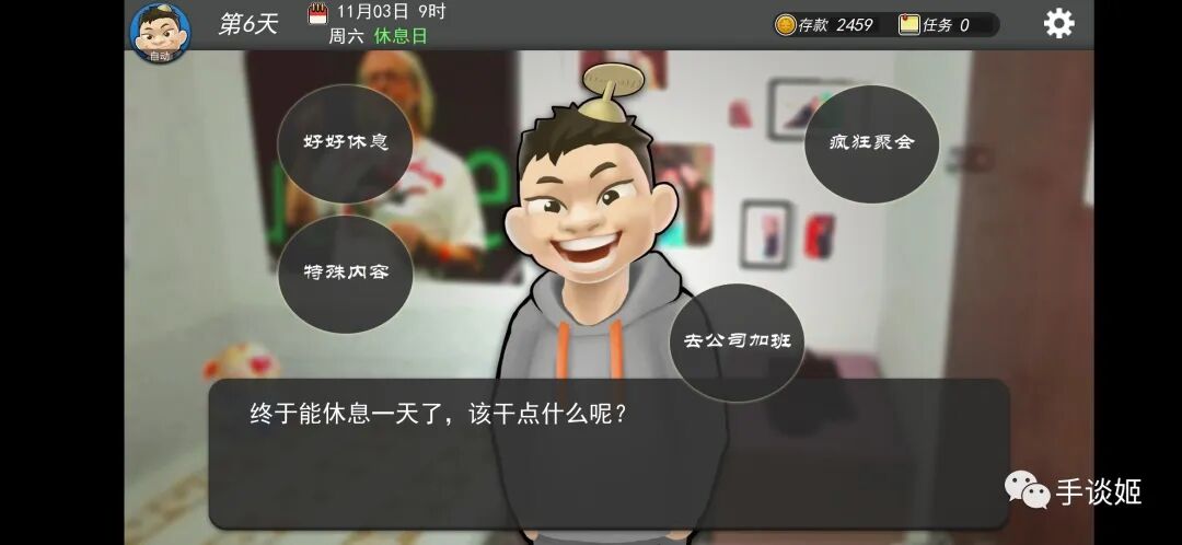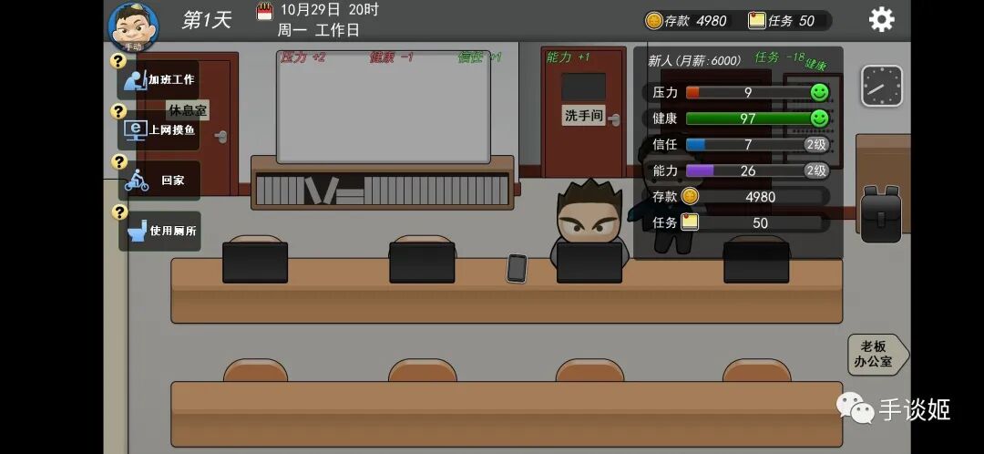 除此以外上班时还可以刷手机,上厕所,吃外卖,外出闲逛,分别可以增加或减少各种状态。