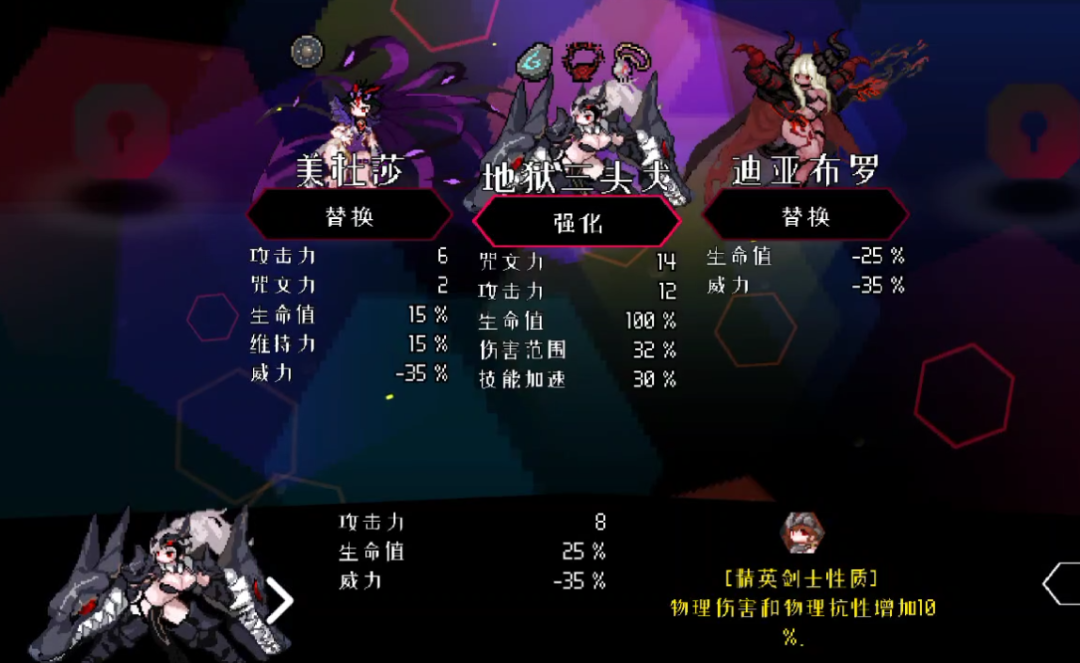 玩法方面,玩家需要操控恶魔们释放弹幕,这些弹幕在每一关结束后都可以获得相应的升级,比如一开始只能发射一发导弹,后来就可以发射两发,可能是导弹获得了穿透的能力,又或者送你几发浮游炮之类的,是肉鸽类游戏中常见的升级设定了,找到合适的配对,可以让这些强化buff组合成更为强力的效果,让勇者们难以招架。