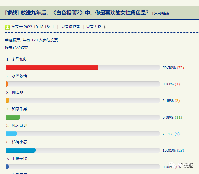那么说到galgame,前些日子在S1论坛上,网友举办了《白色相簿2》的人气角色投票,一眼看上去,哎,怎么冬马和纱领先这么多啊?但定眼一看这选项里压根没有小木曾雪菜啊??