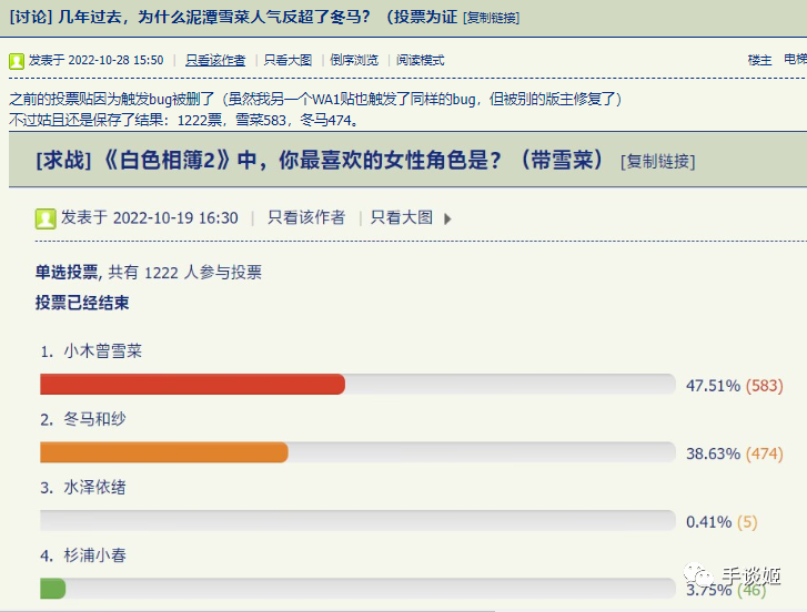 于是又有网友发起了一个正常的投票,可是根据这个网友所言,正常投票却被S1论坛给删除了,虽然楼主说是因为“bug”……手谈姬却有点怀疑版主的党争立场了,难不成版主是冬马党?