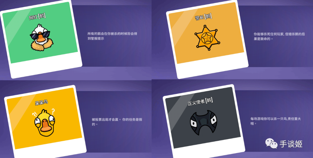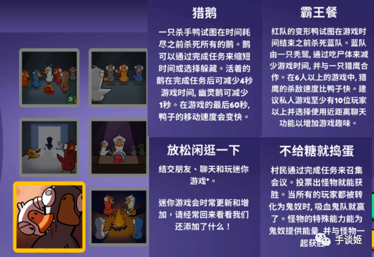 游戏的玩法是狼人杀,这么简洁的介绍让手谈姬不由地钦佩起自己来,说得详细点就是有鹅和鸭子两种基础角色,鸭子可以杀鹅,有人发现尸体就可以告诉大家来进行票选环节,大家把凶手投票放逐出去,你看,这不就是狼人杀吗?