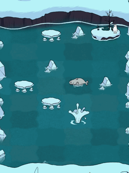 这款游戏是益智闯关类型的玩法,玩家可以划动冰层,让熊妈妈靠近小熊所在的冰层,冰层在移动过程中会慢慢变小,如果玩家操作不合理,熊妈妈就会掉落水中,像鲸鱼一样喷水,如下。