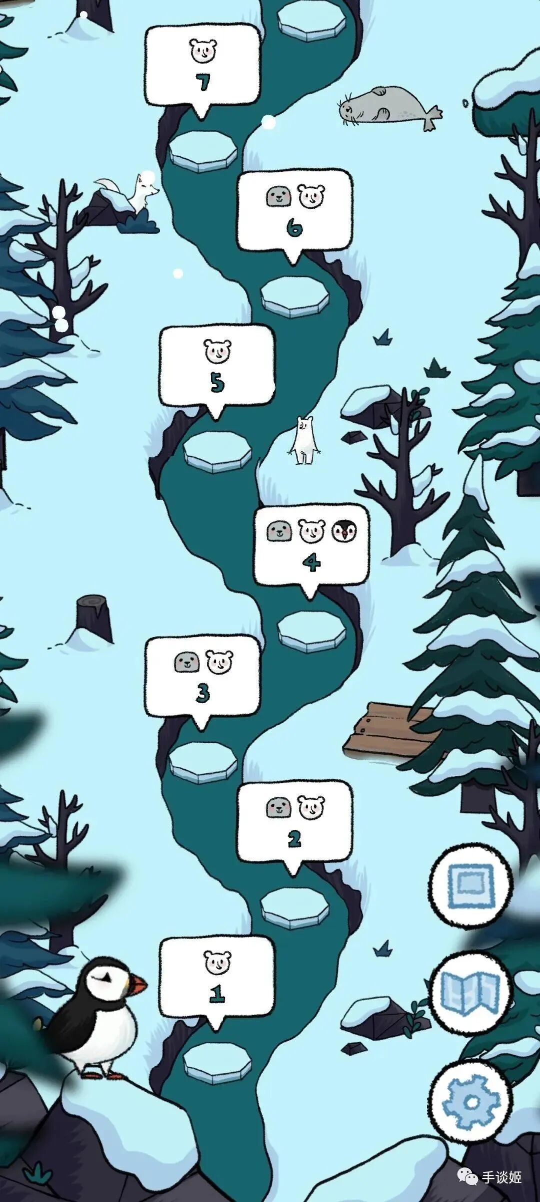 这款游戏采用了非常可爱的绘本画风,不光其中的熊妈熊宝非常可爱,游戏中还有企鹅、海豹、鲸鱼、北极狐等可爱的小动物,他们或是像挂件那样在屏幕一侧,又或是干脆直接出现在关卡内部的互动中。