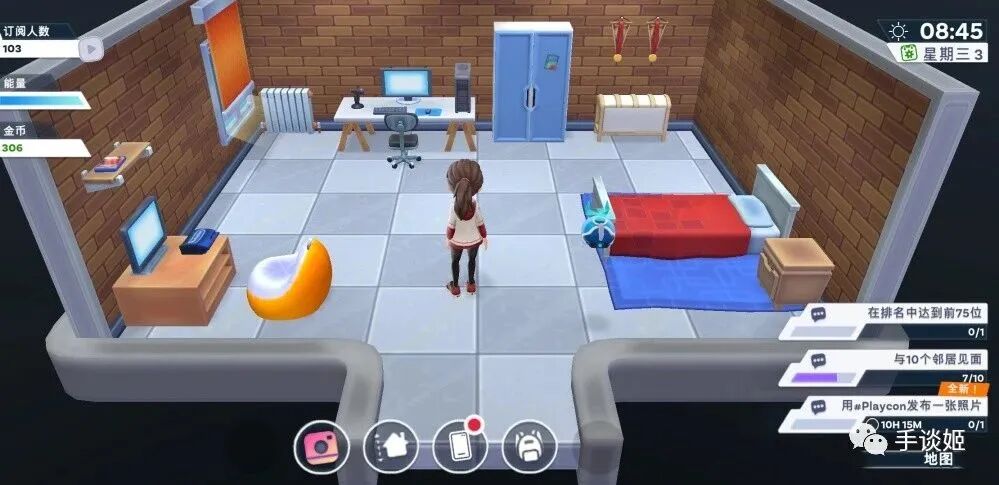从一个只有电脑手机的简易出租屋开始,玩家逐渐购买游戏机、更贵的拍摄设备,购买绿幕,住更大的房间,这些在游戏中都能体验到。