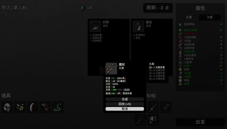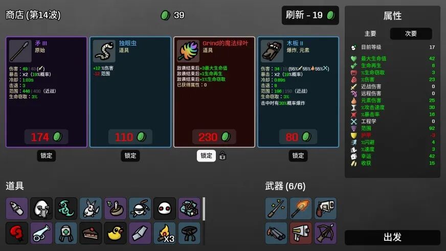 以上均为随机刷新。如果有新意的货物却没有w不要怕,商店里的物品可以锁住。武器有持有上限,道具没有,但同名同等级武器和合成。