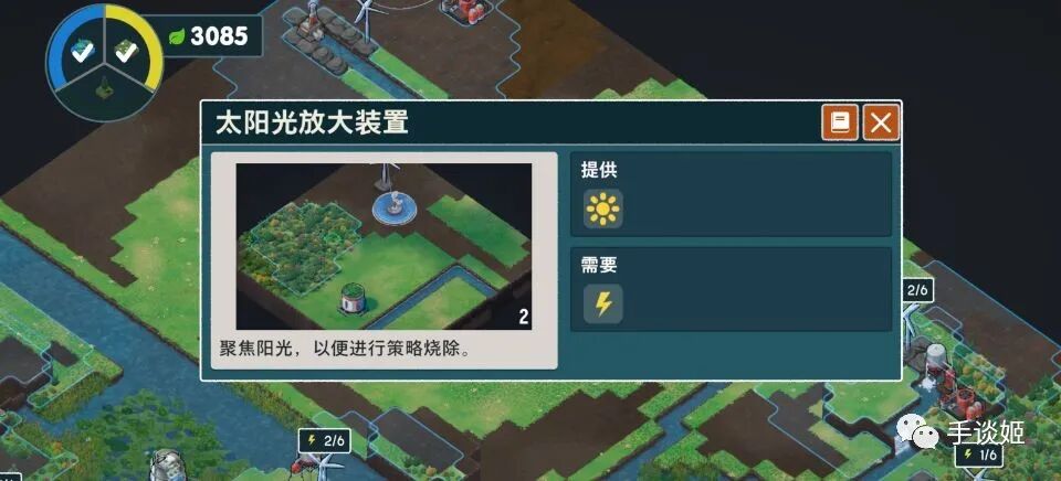 每种机器所覆盖的范围是有限的,有的还会有地形限制,所以游戏需要些许规划,最好能用较少的机器修复最大数量地块。
